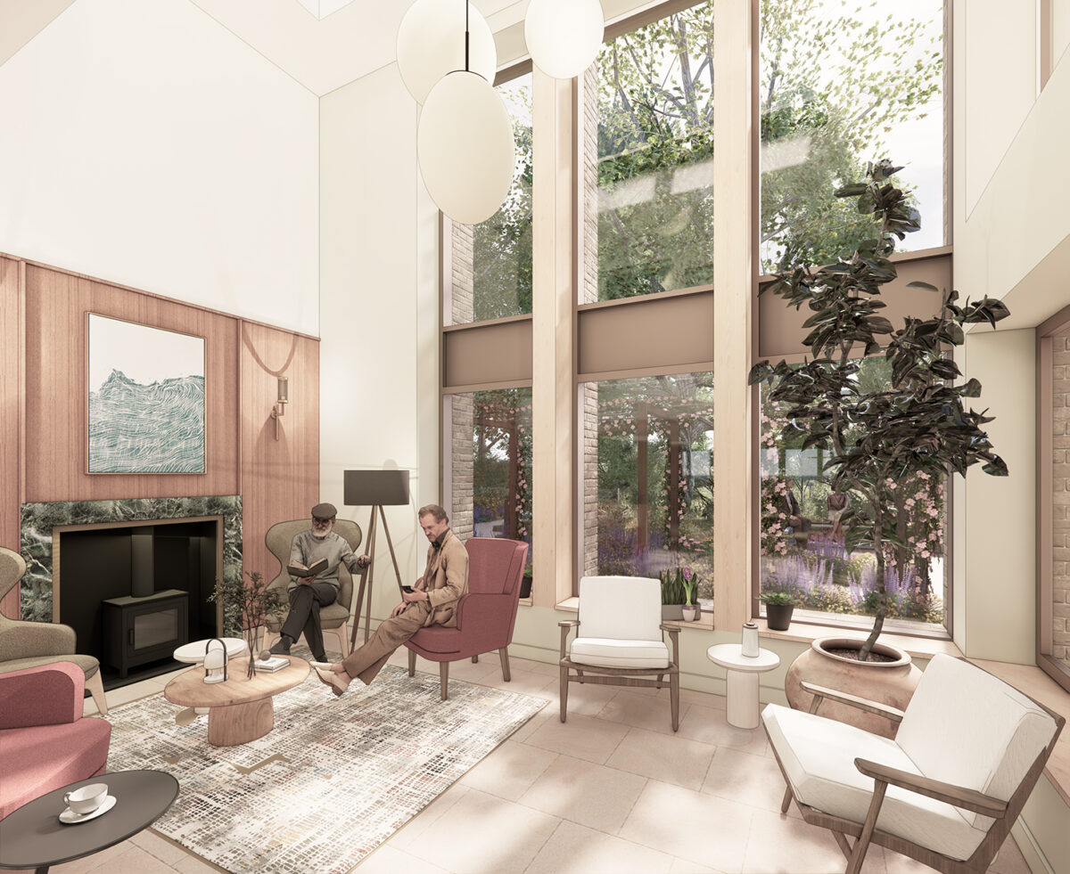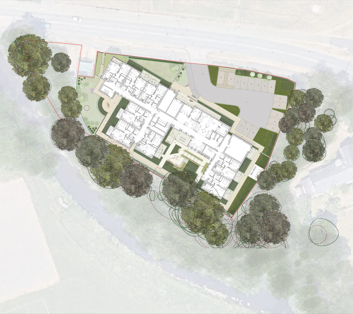 Despite some significant site constraints (for example, existing services easements and ecology) the key design driver has been the massing and form of the building, with a clear distinction between the different elements of the building. A ‘F’ shape footprint provides a ‘solid’ edge to the main road, and steps down in scale closer to the manor house, as not to detract from the historical asset. Similarly, the form and materiality of the building is such that is has a more ‘farmstead’ typology with the ‘outbuildings’ located in the shadow of the manor house. That farmstead typology continues with the material palette, employing corrugated metal cladding, high quality stock brickwork and feature stonework. To the rear, and closest to the river, two communal courtyard gardens take advantage of a southernly aspect over Afon Lwyd.