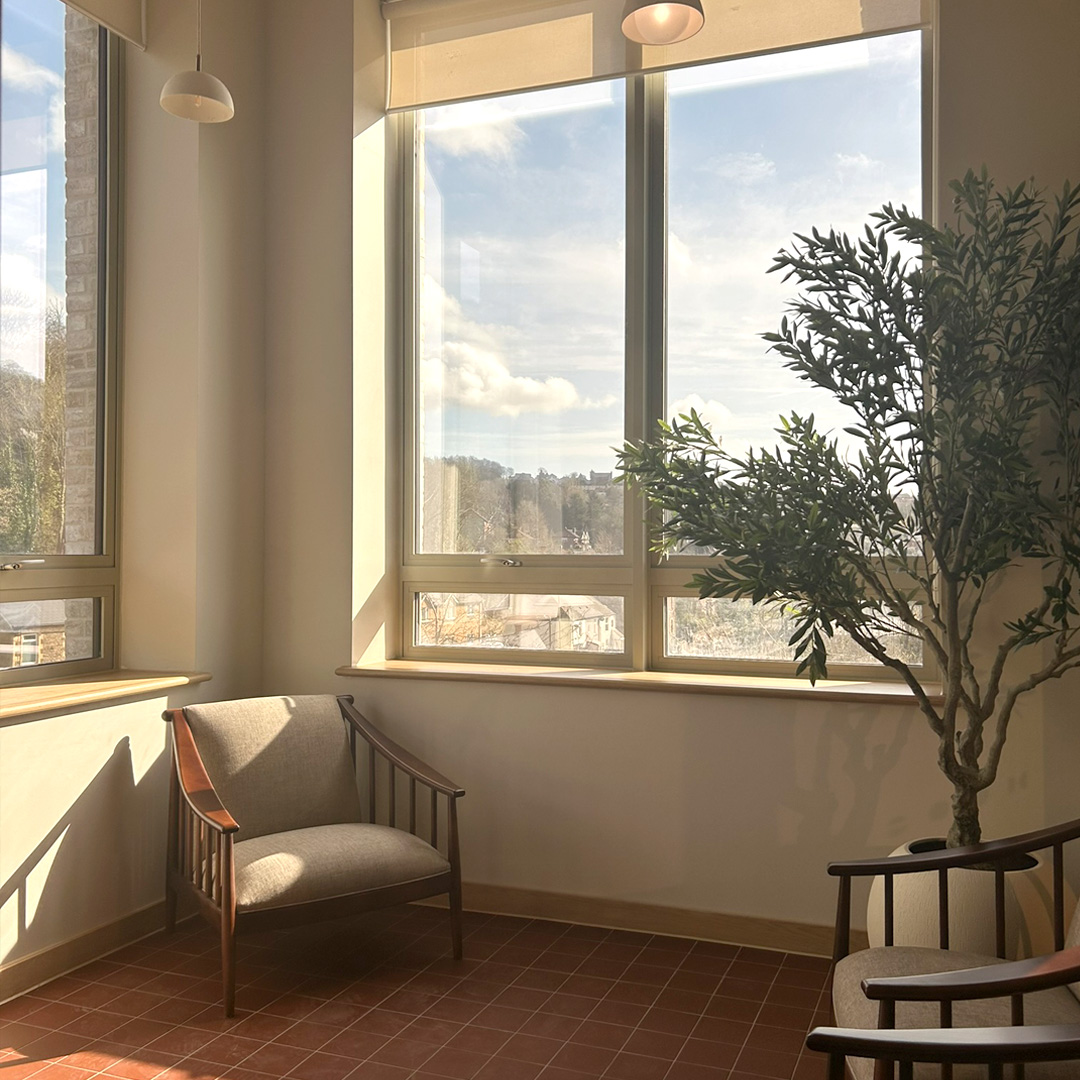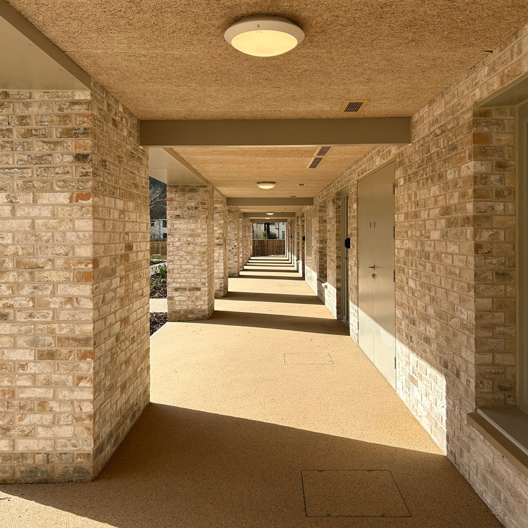 Each apartment is dual aspect with generously proportioned windows, providing access to sunlight and natural ventilation. Balconies and terraces offer a private amenity space for every apartment connected to the spectacular valley landscape in which the project sits. All apartments are connected to a shared external walkway wrapping the courtyard garden. Apartments have their front doors and kitchen windows onto these walkways helping form a better-connected community within the scheme, encouraging residents to remain active and engaged, all to the benefit of their health, wellbeing and independence.