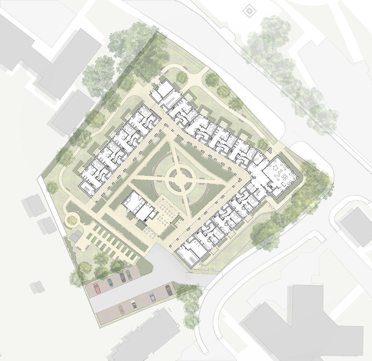 A generous series of communal spaces, each varying in scale and use sit on the key street corner. A double height residents’ lounge at ground floor level, flexible craft, IT and fitness studio spaces at second floor level and cosy TV space, library and games room at third floor level. All designed to gently encourage sociability within the resident community and provide opportunities for the wider community to visit and enliven the scheme. A small wintergarden sitting at fourth floor level, acts as a gently illuminated beacon for the scheme, a warm light drawing residents back home.